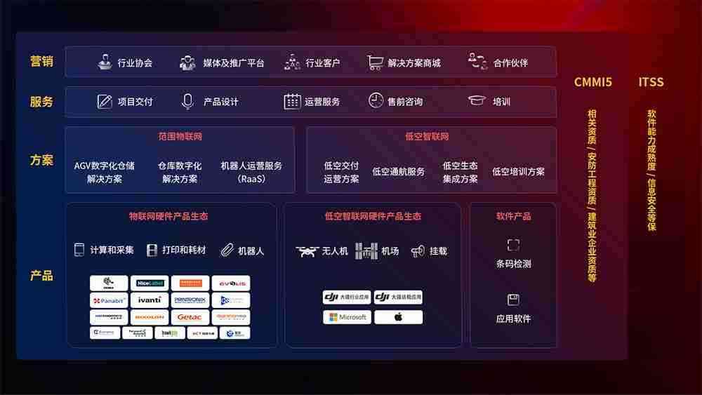 聚合国内外先进的物联网硬件产品品牌,,,聚焦数字化仓储、、机器人运营、、、、低空智联网等领域,,,共同打造适合客户业务场景的解决方案并提供交付服务
