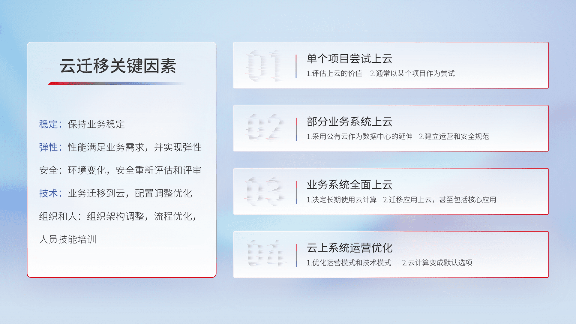 结合实际业务,,,,从规划设计、、云平台选型、、、云原生改造、、、、数据迁移、、、集成交付,,,迁移全过程为客户识别最佳上云路径,,做好风险识别管理,,,设计网络架构、、、、身份权限、、、安全审计合规、、操作审计、、日志审计、、、监控告警策略、、、、多站点容灾设计等,,对云上基础设施进行整体规划,,提升IT治理水平,,,,以满足弹性、、高可用、、、、高性能的需求。。