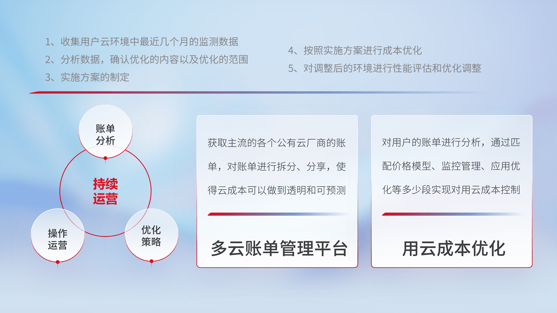 通过多云纳管,,,,以统一的资源数据模型把客户的云资源进行抽象和封装,,进而实现对多云资源的统一操作,,保障云资源管理的可靠性、、、稳定性与可用性。。量身定制化运维内容,,,,配置、、、、开发运维、、、补丁管理、、、备份、、、监控、、、认证和访问管理、、、、审计和日常巡检等,,,,保障在用云过程中的可靠度,,,,稳定度以及高可用率。。。。